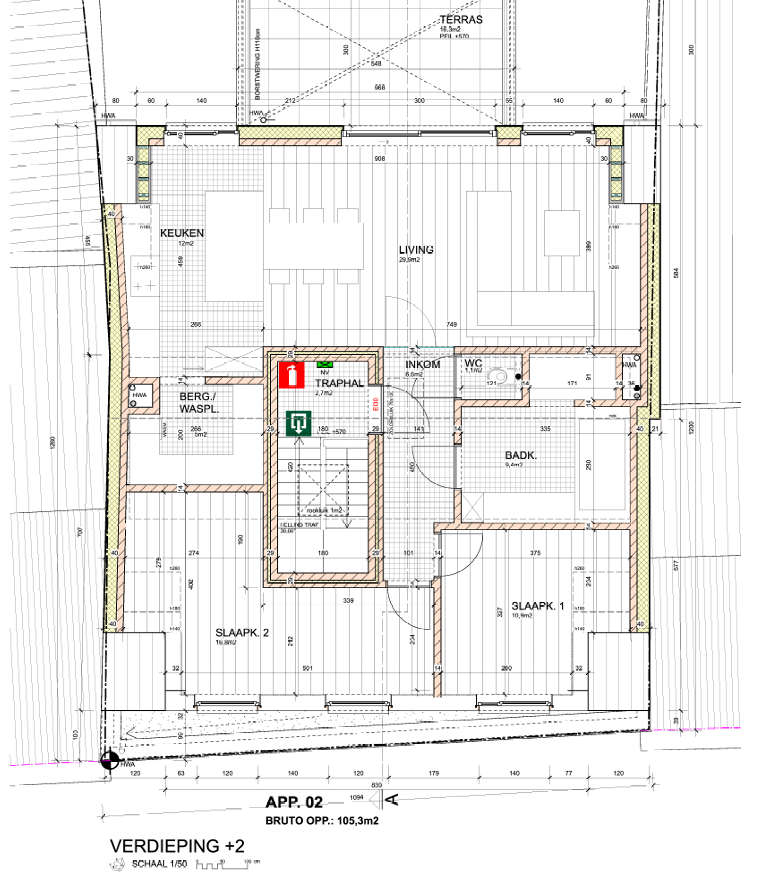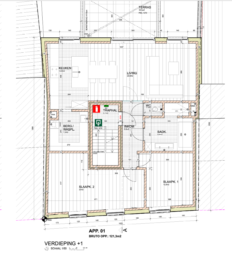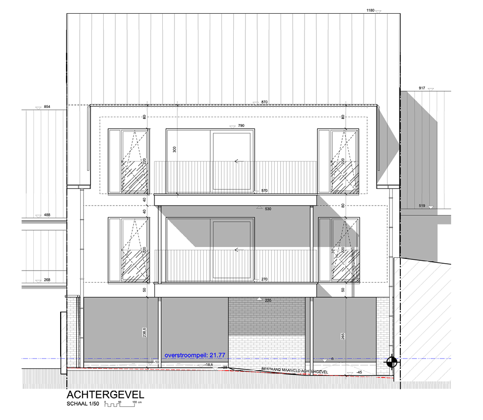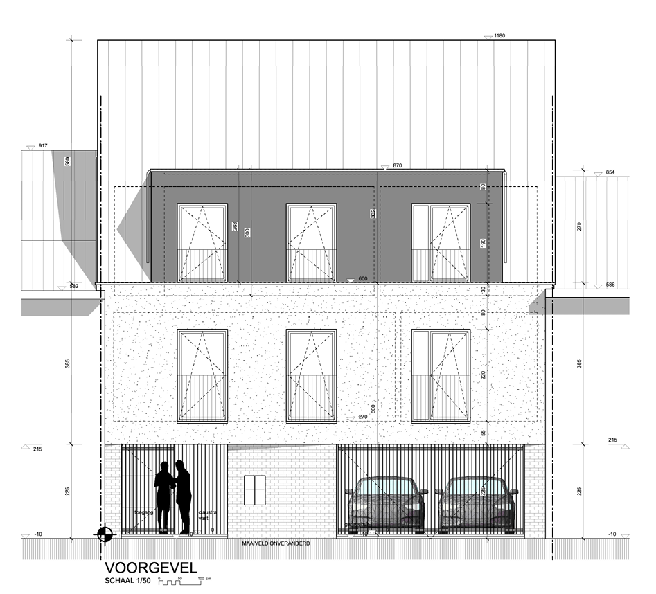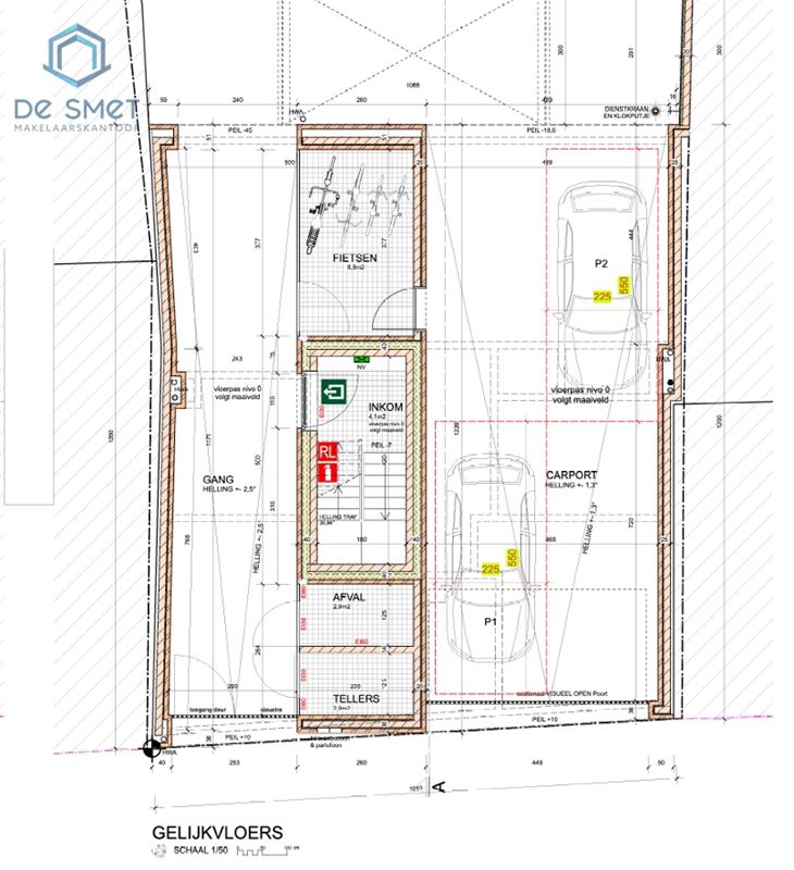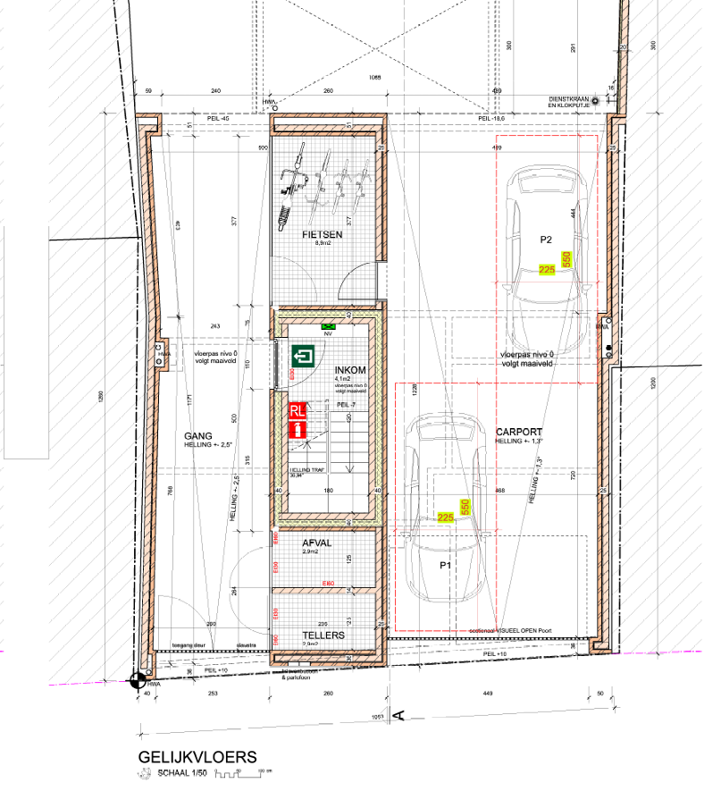 Il s'agit d'un rez-de-chaussée avec un hall d'entrée, des caves, un local pour vélos ainsi qu'un grand carport pour 2 voitures, ainsi qu'une bande de jardin.