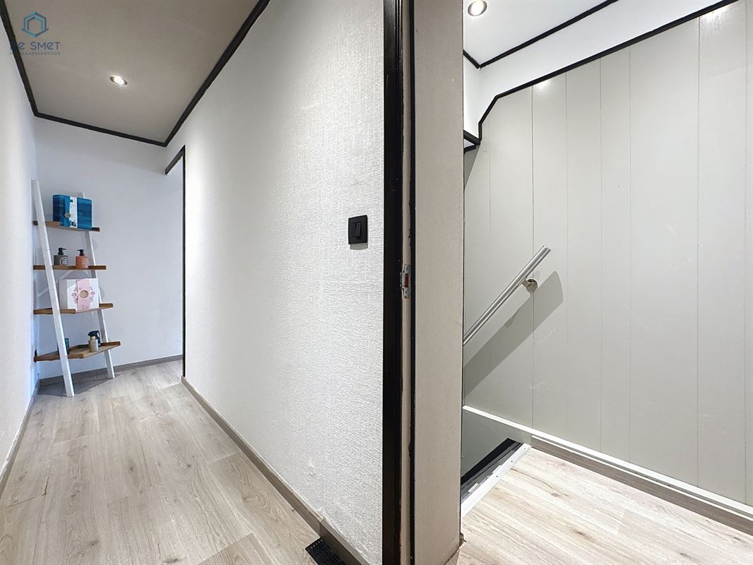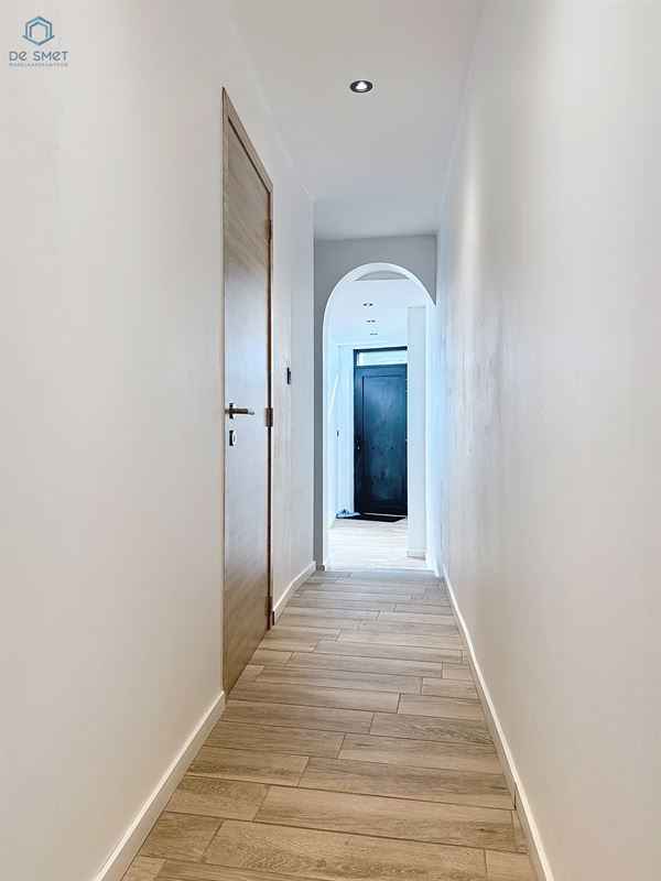 U komt binnen via de inkomhal. Vooraan bevindt zich een aparte polyvalente ruimte met wateraansluiting, perfect als slaapkamer, bureau of voor een zelfstandige activiteit. Verder is er een apart toilet, een volledig ingerichte keuken met alle ingebouwde toestellen en een open, lichtrijke leefruimte met gezellige pelletkachel.
