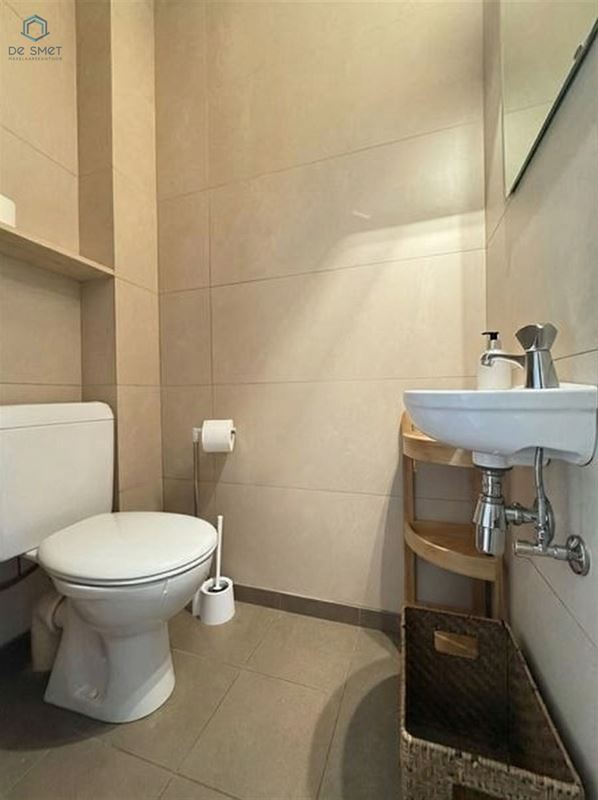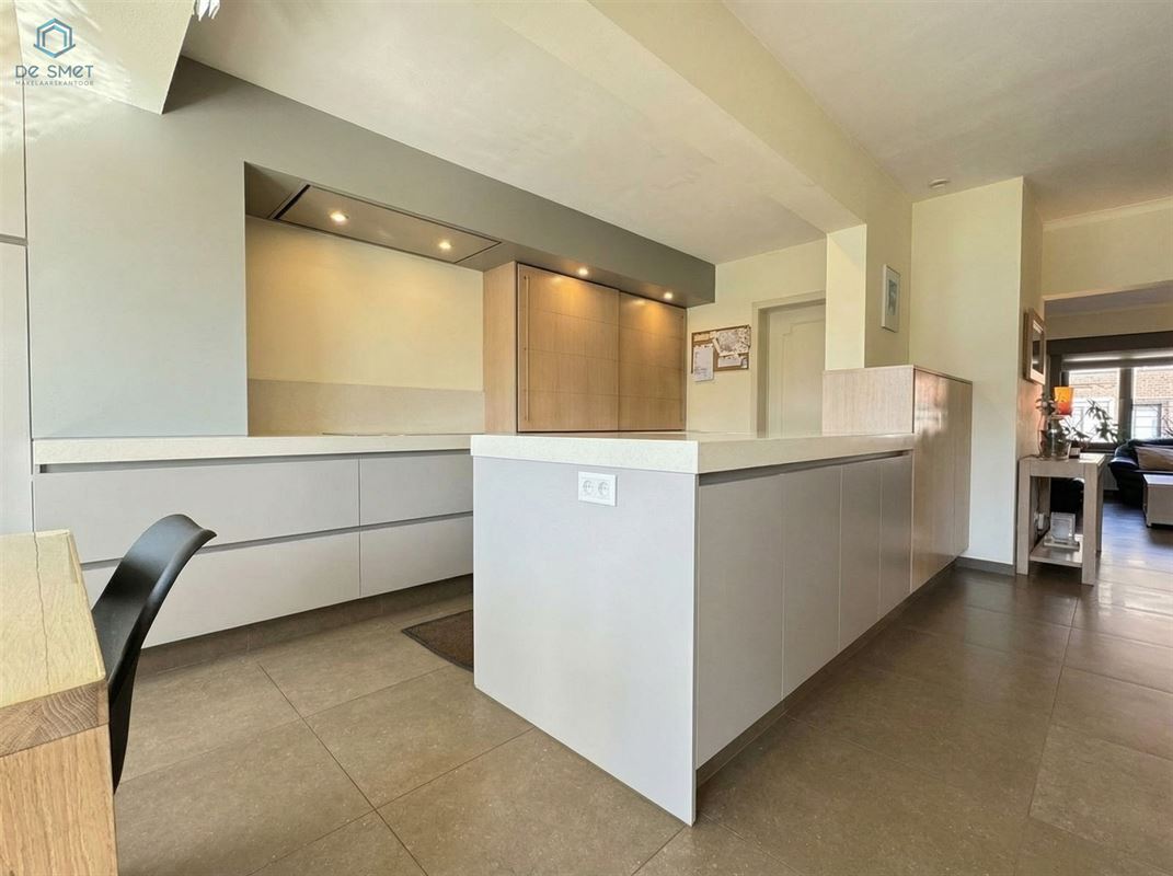 Inkomhal met apart toilet, lichtrijke en ruime leefruimte met gezellige living en eetplaats, volledig uitgeruste keuken met eiland. Aansluitend vindt u het terras en de tuin, met toegang tot de ruime garage via een achterliggend baantje.