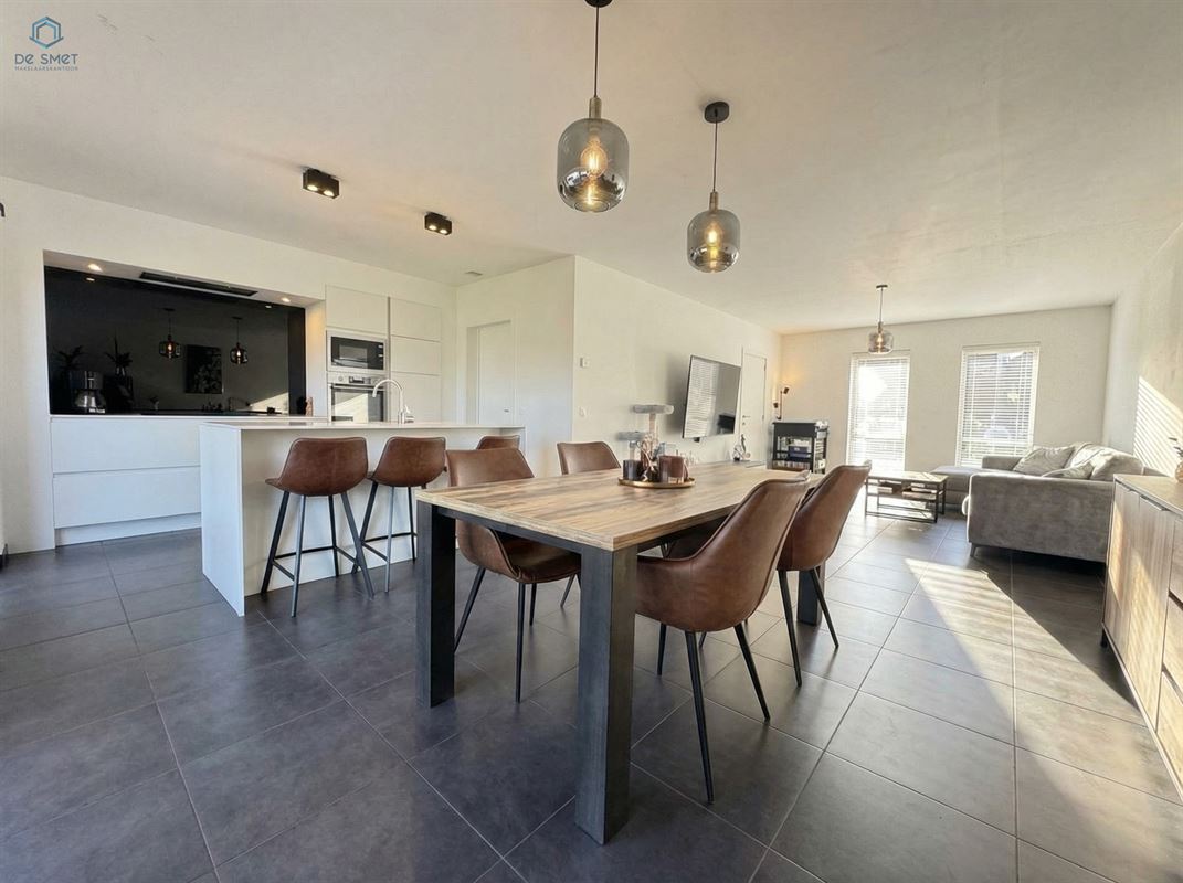 Inkomhal met gastentoilet, lichtrijke open leefruimte met eetplaats en een volledig ingerichte keuken met eiland. Aansluitend bevindt zich een praktische bergruimte.