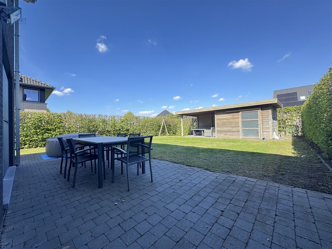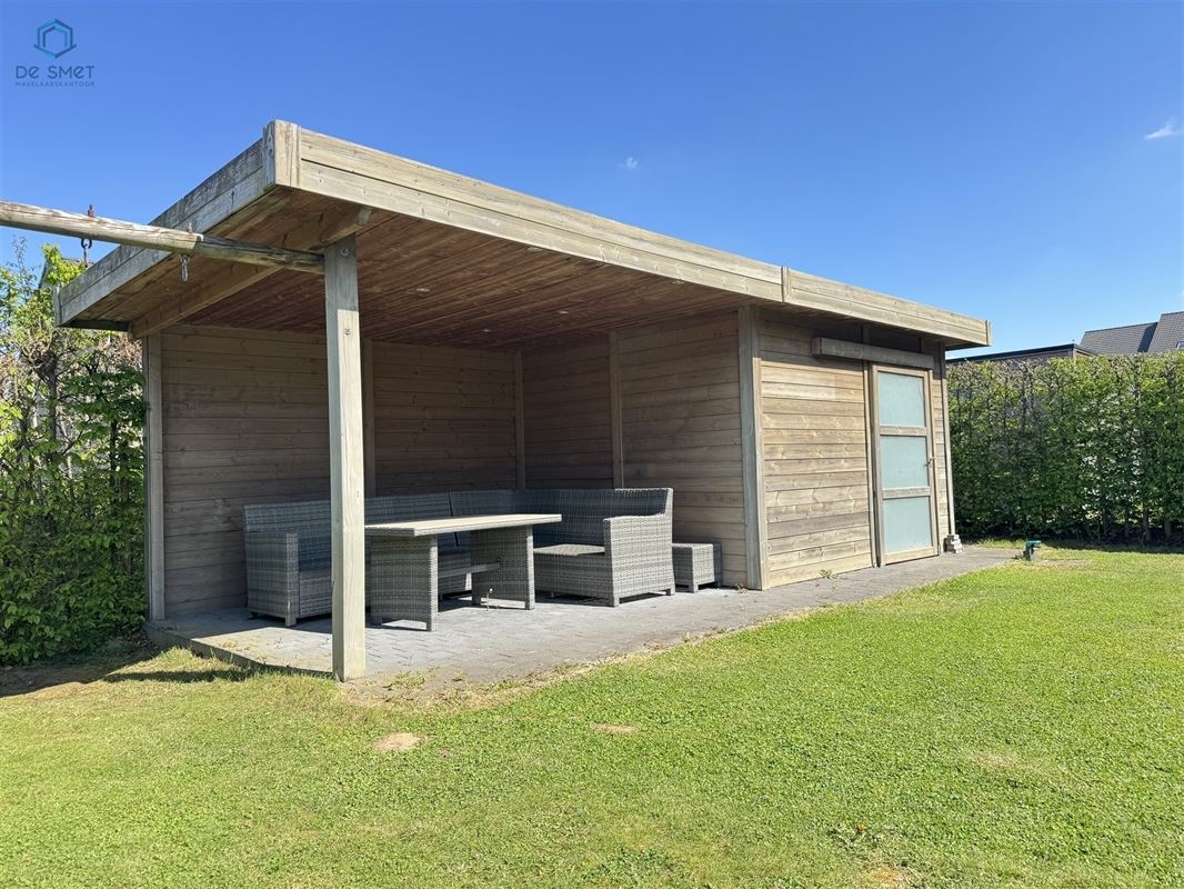Oprit vooraan en een aangename tuin met terras, tuinhuis en overdekte zitruimte. Regenwaterput van 10.000L aanwezig.