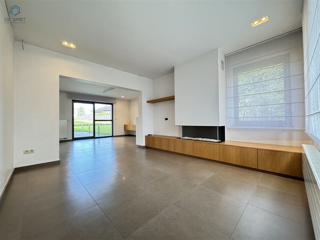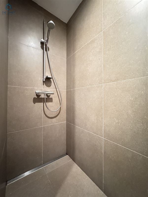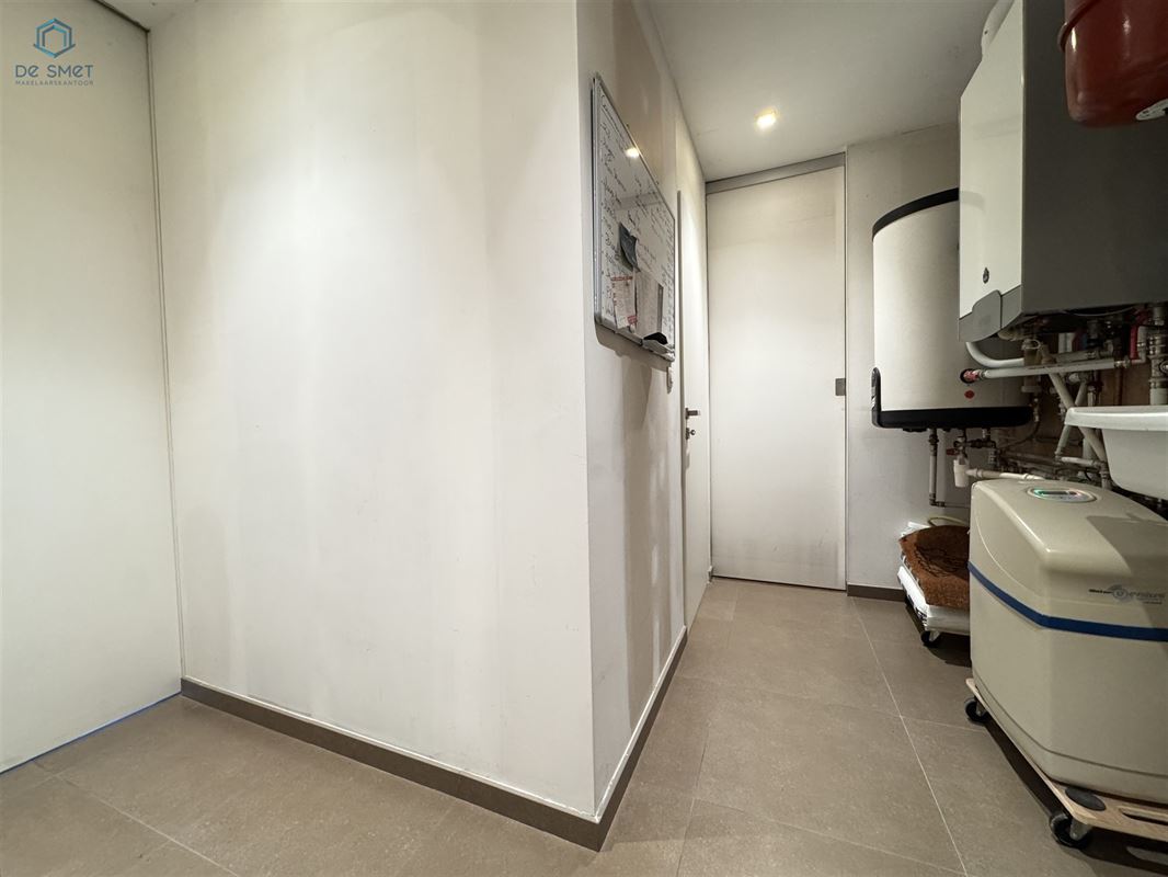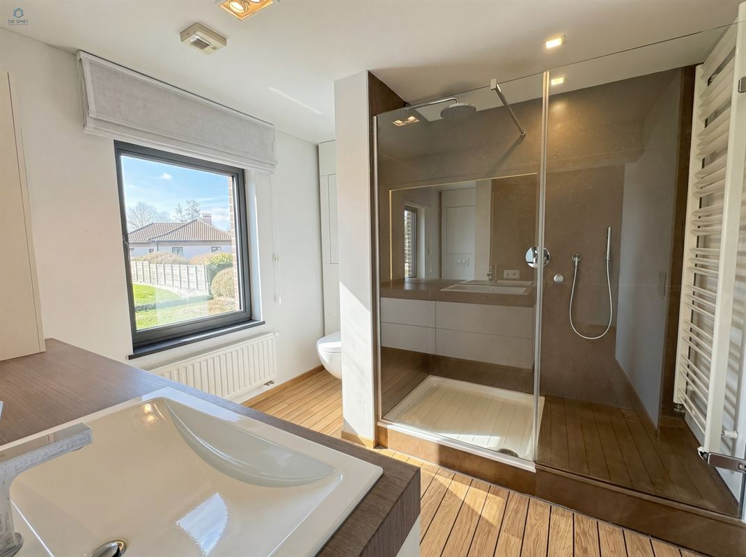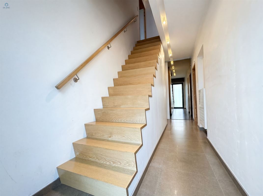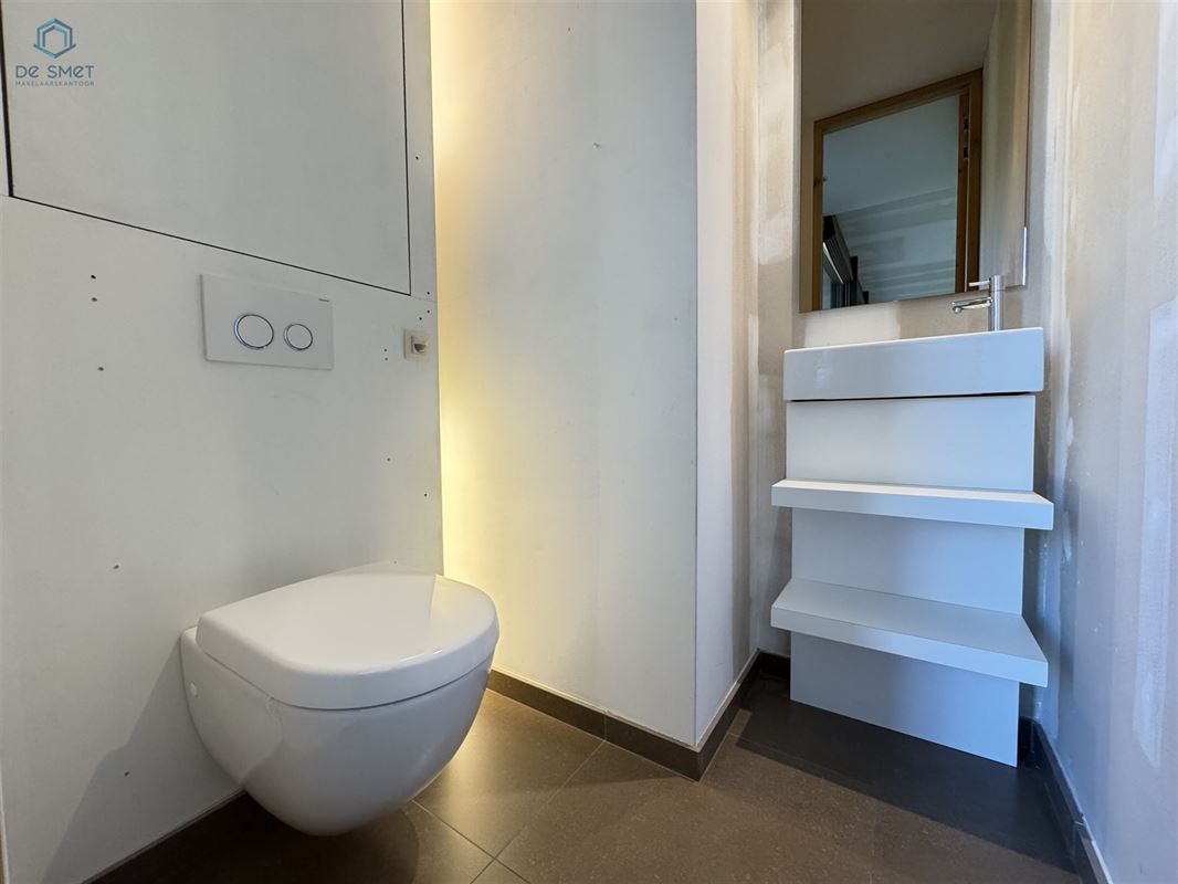 U komt binnen via de inkomhal, die toegang geeft tot de garage met automatische poort. De gezellige living vormt het hart van de woning en sluit aan op de praktische indeling. Verder vindt u op het gelijkvloers een apart toilet en een bergruimte met douche.