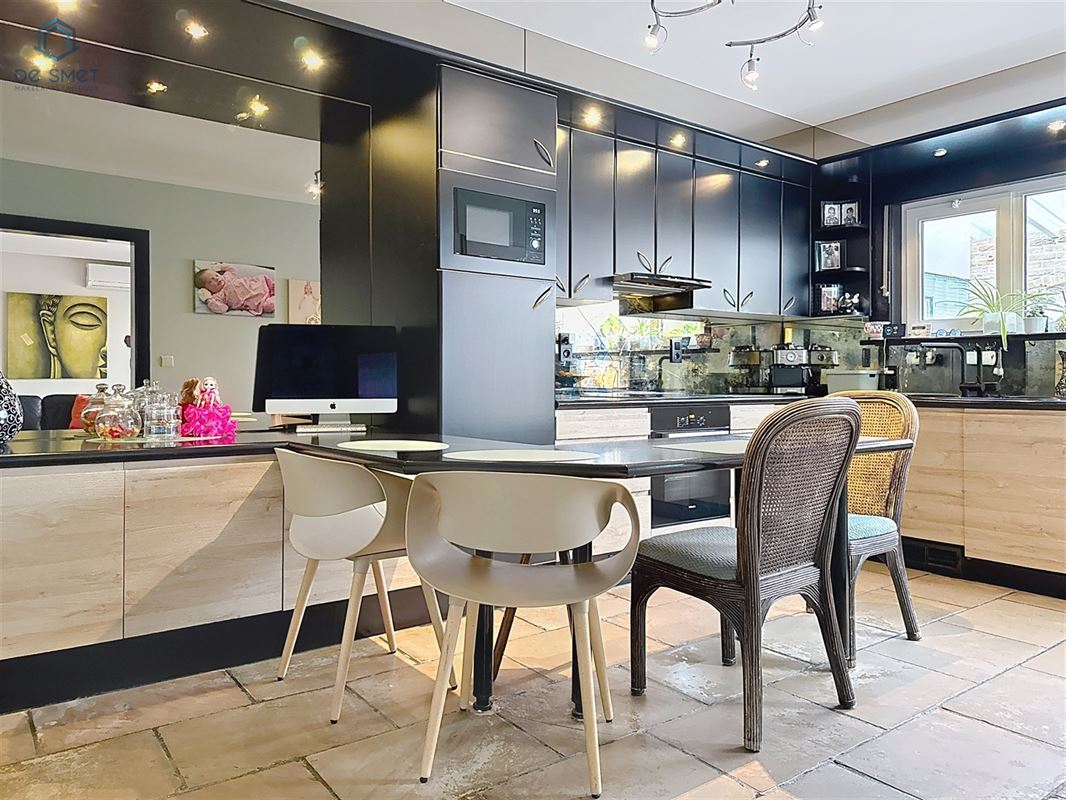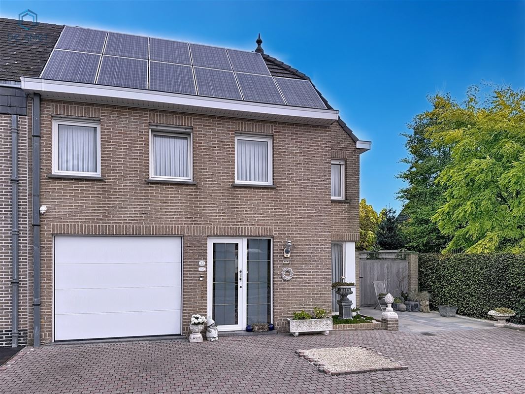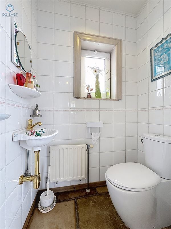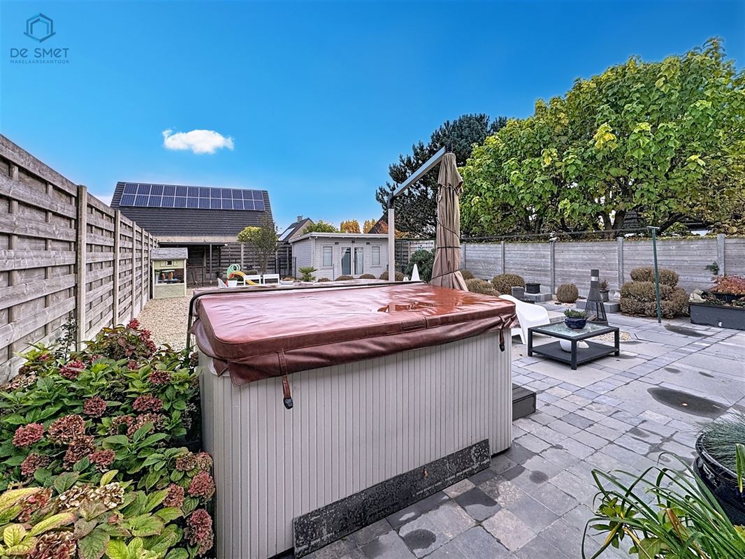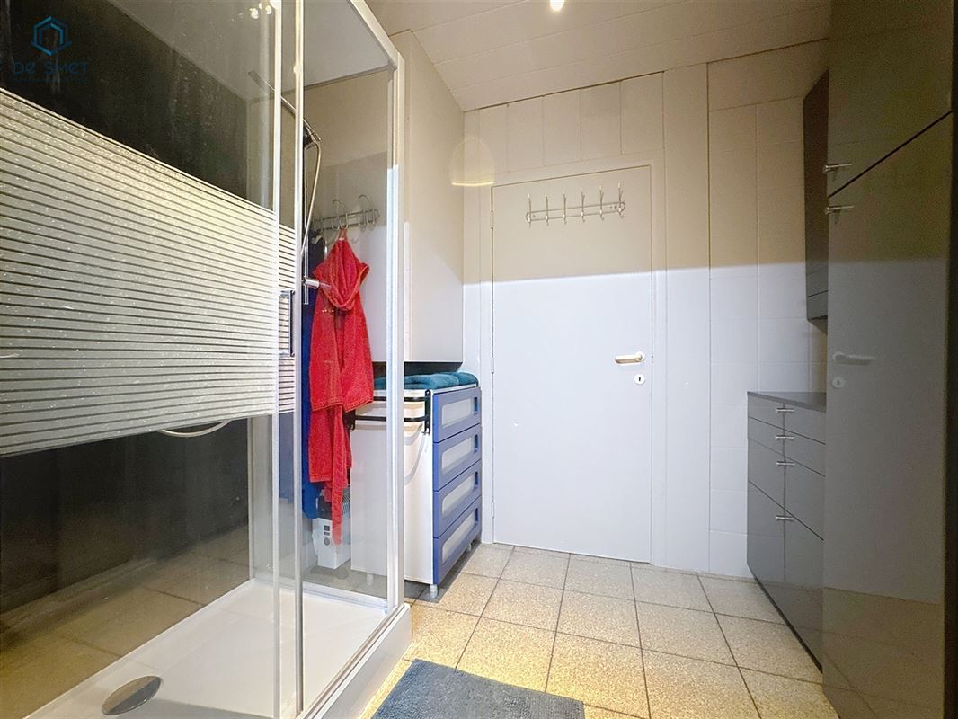 garage met automatische poort, inkomhal, apart toilet, lichte leefruimte met eetplaats, volledig ingerichte keuken (alle toestellen ingebouwd), berging met douche, veranda en aangename tuin met tuinhuis.