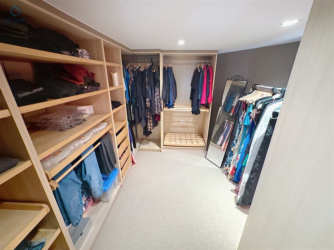 Op de eerste verdieping bevindt zich een ruime slaapkamer met aansluitende dressing. Achteraan is er nog een tweede kamer, perfect geschikt als kinderkamer, bureau of extra berging.